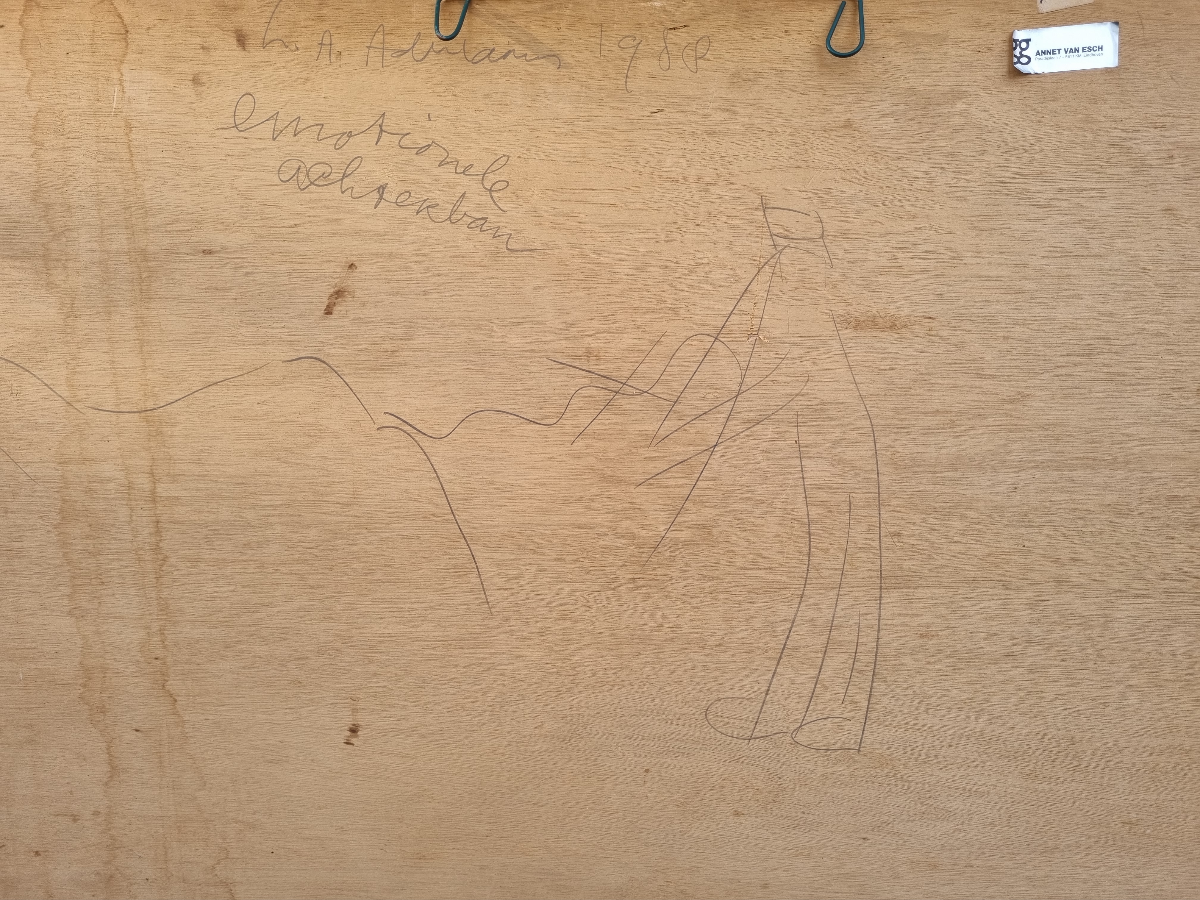 Je zou verwachten dat Adriaans, die schilderde op veevoederzakken, zijn werk maakte in de schuur, bij zijn paarden. Maar dat was niet zo. Zodra hij inspiratie had en de paarden waren verzorgd, vertrok hij naar zijn atelier om daar te schilderen. Zijn voorkeur voor onconventionele materialen kwam eerder voort uit zijn belangstelling voor arte povera, een kunststroming die eind jaren zestig opkwam, net nadat Adriaans zijn opleiding aan de kunstacademie in Den Bosch had afgerond. (tekst Irma van Bommel)