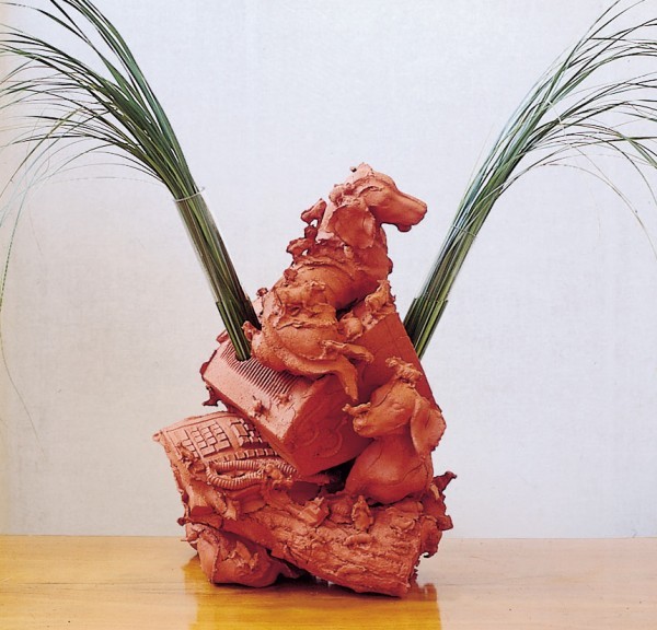 Beeld in terracotta, glas en verse bloemen op een houten spoel. De doorsnee van de spoel/sokkel is 65 cm en de hoogte 57 cm. Vervaardigd in opdracht van Cristian Stein voor een Bank in Londen.