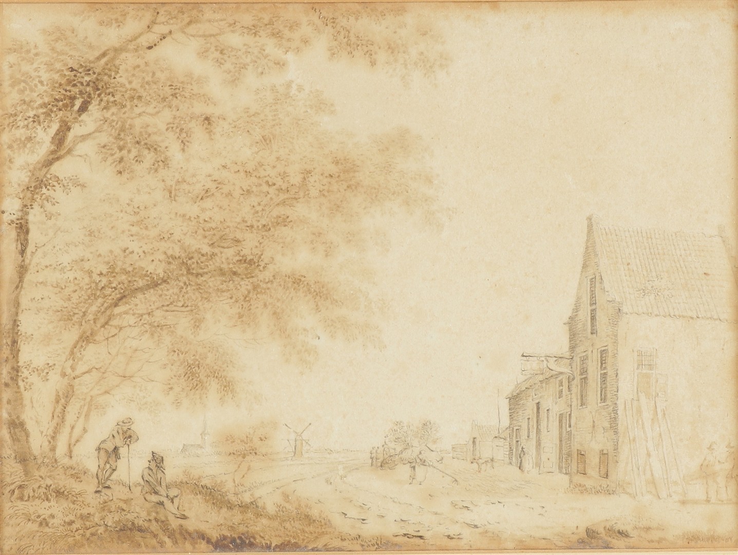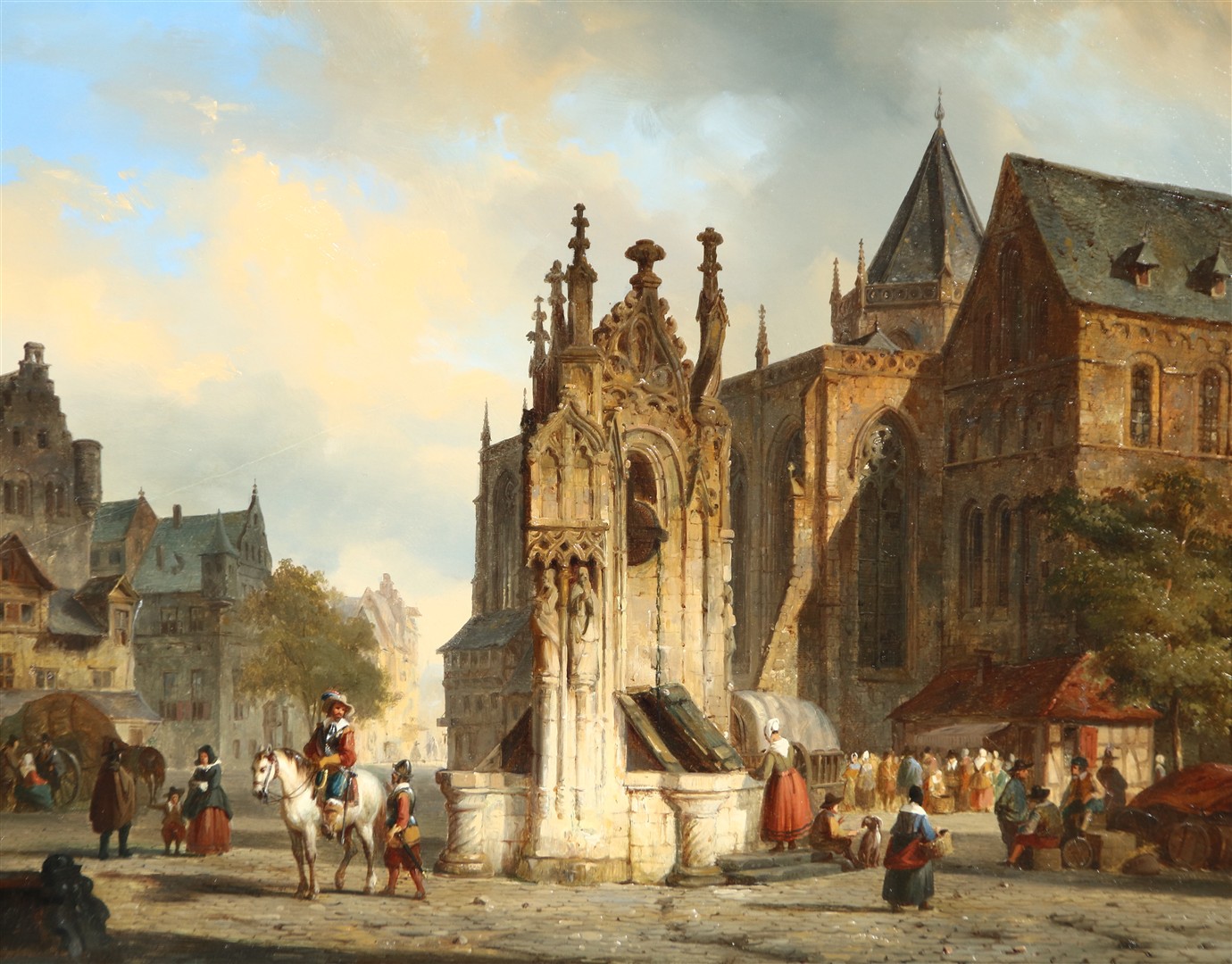 Stadsplein met vele personages en een ruiter bij een waterput (1843)