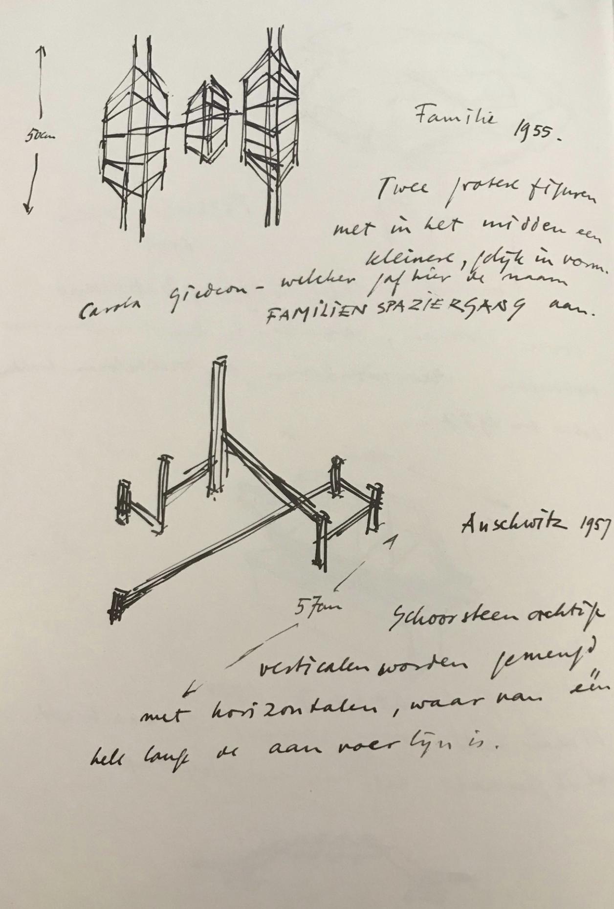In an interview with the artist in Aldo van Eyck 1986 (pp. 62-63), Carel Visser remembered meeting the ten-year older Aldo van Eyck in the early 1950s through Carel's brother Martin Visser. In Carel's words, it was 'friendship at first sight'; the early recognition from Aldo of Visser's work was very important to the young sculptor. Van Eyck spoke to Visser about Constantin Brancusi and made it possible for the Vissers to meet Brancusi at his studio in Paris, a visit which had a lasting impact. Aldo van Eyck designed three exhibitions of Visser's work: in De Zonnehof, Amersfoort (together with paintings by Joost van Roojen) in 1972, in the Stedelijk Museum, Amsterdam, in 1972 and finally in the Kröller-Müller Museum, Otterlo, in 1989. See Carel Blotkamp, Carel Visser, Utrecht, 1989, p. 79, for another version of the same sculpture. Another version of the same size is in the collection of the Stedelijk Museum, Amsterdam (as 'Wandelend Gezin', inv.no. BA 529).
