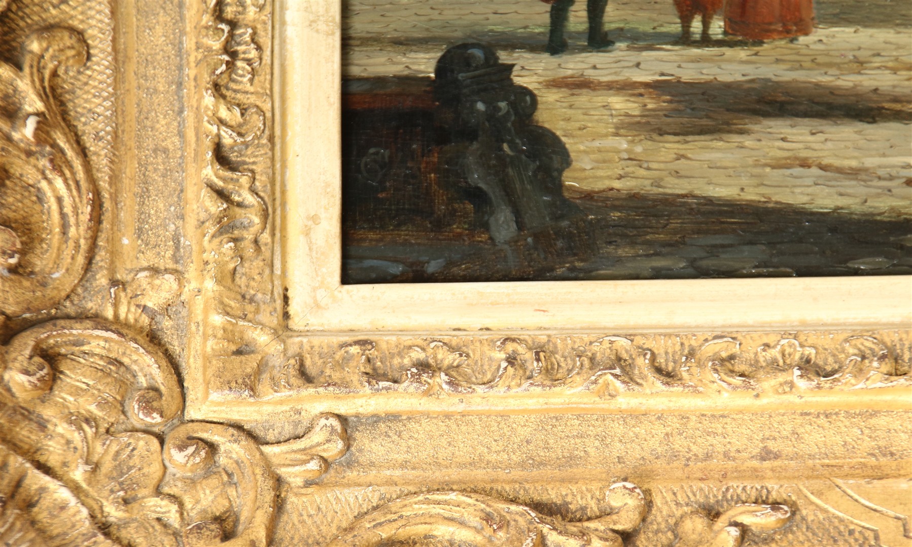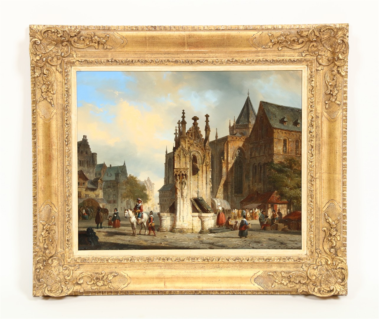 Stadsplein met vele personages en een ruiter bij een waterput (1843)
