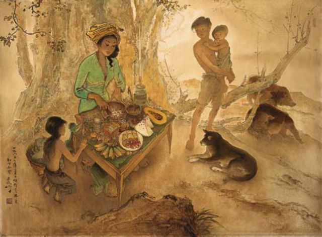 Lee Man Fong was a painter born in Guangzhou, China. His father, a merchant with ten children, brought him to Singapore. When his father died in 1930, Man Fong had to work hard to earn a living for his mother and siblings using his skill in painting ads and artwork. However, that was not enough for him. In 1932, he moved to Jakarta, Indonesia. The tension between nationalist groups such as Persagi (Persatuan Ahli-ahli Gambar Indonesia, or Association of Indonesian Draughtsmans) and Indische-Holland kunstkring community stimulated him. In 1942, Man Fong was jailed because of his opposition to Japanese colonialism in Indonesia. After six months in jail, Takahashi Masao helped him gain freedom. This Japanese officer was interested in his artistic potential.