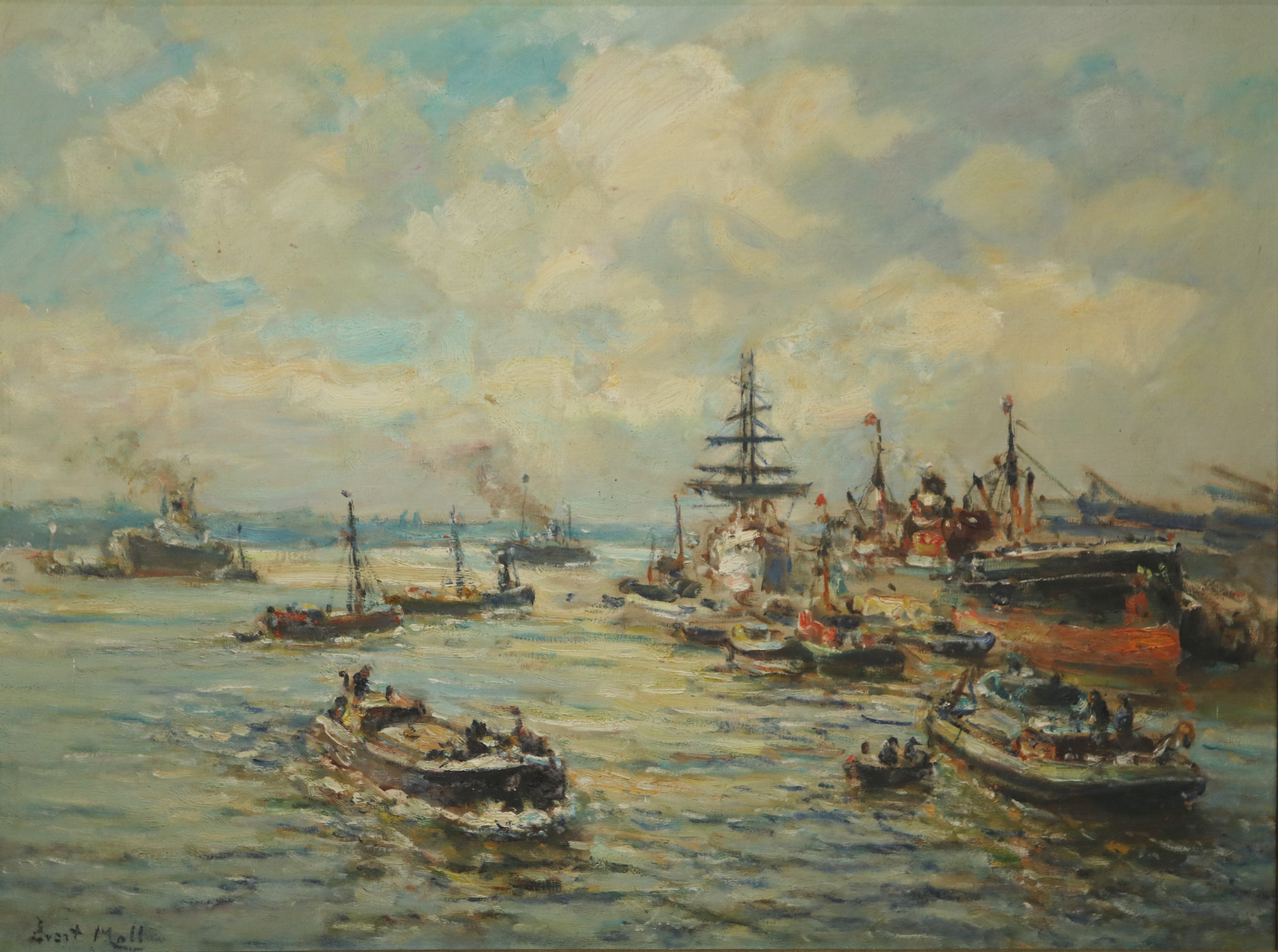 Evert Moll woonde en werkte tussen 1895 tot 1930 in Voorburg, Londen, Parijs, Den Haag, en Rotterdam. Hij vestigde zich vervolgens in Den Haag. Daar kreeg hij raadgevingen van Willem Maris en vormde zich verder zelf. Hij werkte veel in opdracht van kunsthandelaren in de Verenigde Staten en in Canada. Schilderde landschappen, maar vooral rivier, zee- en havengezichten en in zijn laatste jaren ook stillevens. Werk van Evert Moll bevindt zich o.a. in de Rijkscollectie, het Zuiderzeemuseum en het museum Boymans-van Beuningen. Evert Moll was geen hemelbestormer en geen kunstenaar met een onverzadigbare vernieuwingsdrang. Nieuwe ontwikkelinmhen gingen schijnbaar onopgemerkt aan hem voorbij. Hij bleef trouw aan zich zelf en aan de beginselen van de Haagse School. Evert Moll is vooral bekend van zijn ruim duizend havengezichten. Bijster veel is er van deze schilder niet bekend. Wel, dat hij graag en vaak vertoefde in de Rotterdamse haven. Het reilen en zeilen in een haven,de drukte en de traagheid van de kollosale zeeschepen boeiden hem mateloos. Hij hield van de geur van het water, de stookolie en de wind. Evert Moll was meer dan een schilder van havengezichten. Ruim de helft van zijn totale oeuvre bestaat uit landschappen, stadsgezichten en bloemstillevens. Ook als Moll landschappen en stadsgezichten schilderde, kon hij het niet laten om veel water te schilderen. Veel van zijn landschappen zijn geschilders vanaf of met uitzicht op het water. Evert Moll, geboren in Voorburg en praktisch zijn hele leven wonend in een wijde cirkel tussen Den Haag en Rotterdam is autodidact. Van jongs af aan is hij bevriend met Albert Roelofs, de zoon van de beroemde Haagse School schilder Willem Roelofs. In huize Roelofs komt hij in aanraking met kunstenaars die rond de eeuwwisseling het kunstklimaat in Nederland bepaalden. Moll kon het zich aanvankelijk veroorloven te schilderen wat hij wilde. Hij leidt dan ook een relatief zorgeloos leven, totdat zijn vader in 1908 failliet wordt verklaard. Dan wordt het flink aanpoten om in zijn levensonderhoud te voorzien. Dat Moll zijn levenlang trouw bleef aan de principes van de Haagse School, betekent niet dat hij geen ontwikkeling doormaakte. Naarmate hij ouder werd, maakten zijn aanvankelijke sobere kleurgebruik en brede penseelstreken plaats voor rijker en gevarieerder kleuren en een fijnere verftoets. Moll schilderde vooral buiten. Met zijn klapstoel en het papier op schoot zat hij aan de waterkant. Veel van zijn werken zijn van hetzelfde formaat: 19 bij 31 centimeter. Dit is precies het formaat van zijn schilderskist die hij als `onderzetter" gebruikte. Deze paneeltjes dienden vaak als voorbeeld voor de grotere werken die in zijn atelier ontstonden. De havengezichten van Moll laten zich lezen als een geschiedenisboek. Zo legt hij aan het begin van de 20e eeuw de maritieme ontwikkeling vast. Hoe de havens uitdijen, de schepen groter worden en de zeilschepen het veldruimen voor motorschepen. Werk in museum Boymans- van Beuningen nl.:`gezicht op de Waal`(bruikleen). In Zuiderzeemuseum nl.:`de oude haven te Enkhuizen` en in de Rijkscollectie nl.:`woelige zee` en `haven van Rotterdam`.