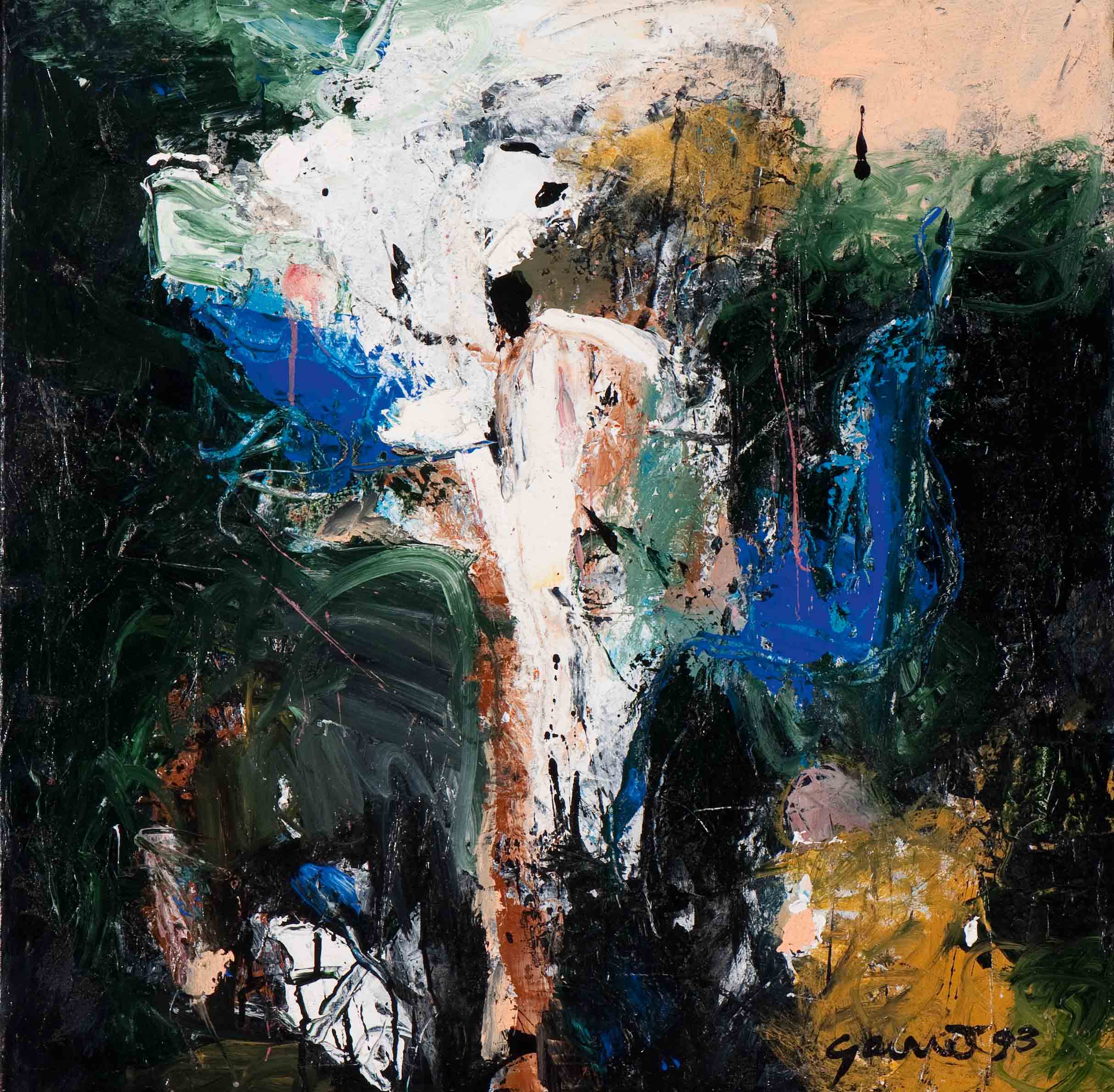 `Ik ben alleen maar verf, zo luidt de lijfspreuk van Gerriet Postma. En zo is het. Postma legt zijn ziel en zaligheid in het schilderen. Het gaat hem niet zo zeer om schoonheid, maar om waarachtigheid. Een goed schilderij is een eerlijk schilderij, voortkomend uit een onverdunde drang tot expressie. En dat betekent dat niet alleen het opladen van vaart en voortvarendheid, maar ook het openstaan voor de zwarte kanten van het leven, voor de schaduwzijde die kwetsbaar maakt. Langzaam maar zeker heeft Postma zichzelf opgebroken, is hij in zijn schilderijen vrijer geworden. Maar er is meer. Postma`s wijze van werken spreekt niet alleen van de allerindividueelste expressie van een allerindividueelste emotie, maar ook van een zoektocht. Naar het geheim achter de materie, naar het effect van verschillende lagen verf over elkaar, naar spanning versus evenwicht. Ook naar zijn zestigste bleek Gerriet Postma wel in voor iets nieuws. Zeker wanneer dat een serieuze ondertoon heeft. In de afgelopen jaren deden zich een aantal van die `gelegenheden` voor. De opmaat werd in 1992 gegeven met het beschilderen van een paneel van plexiglas, twaalf bij twee meter groot, in het voormalige videopaviljoen op het Hereplein in Groningen. Met het plexiglazen paneel had Gerriet Postma de smaak te pakken gekregen. Een volgende project wachtte, van een schaal waarbij de vorige activiteit slechts kruimelwerk was. Het beschilderen van de zeilen van een groot schip betrof een idee waarmee Postma al langere tijd speelde. Het schip ervoor werd gevonden, was de Friese Maatkast De Ideaal, een tweemaster met een zeiloppervlak van 260 vierkante meter. Postma beschilderde de zeilen aan beide zijden, geassisteerd door enkele kunstacademiestudenten. Op het vuurrode topzeil signeerde Gerriet Postma zijn `varende schilderij`, dat in de maanden juli en augustus van 1994 een tocht maakte door de Friese wateren en een oversteek waagde naar Amsterdam en naar Terschelling. Met een grote schildering onder de Museumbrug in de stad Groningen ging eveneens een lang gekoesterde wens in vervulling. Dat Gerriet Postma met zijn `megaschilderijen` naam maakte, blijkt wel uit het in de zomer van 1996 geuite verzoek van de TROS om voor Frank Sinatra, die toentertijd ziek was, een groot werk te schilderen. Postma maakte een schilderij van vijftien bij vijf meter. De TROS legde niet alleen vast hoe Postma het doek in het lokaal van een verlaten school vervaardigde, maar filmde vooral ook het spektakel er omheen. Hoe het werk door de lucht, achter een vliegtuig werd vervoerd, vergezeld van de tekst `Monument voor Frank Sinatra`. Hoe het schilderij boven het hoogste gebouw van Nederland, het kantoor van verzekeringsmaatschappij Nationale Nederlanden in Rotterdam, Zweefde, terwijl `Nederlands Sinatra` Lee Towers het lied `My Way` ten beste gaf. En hoe het werk uiteindelijk aan de Euromast werd bevestigd. Gerriet Postma houdt van groot. Van groot, groter, grootst. Postma is de man van de grote stappen, de grote mond, het grote gebaar. Maar binnen dat grote gebaar valt het kleine en het subtiele te bespeuren. Tegenover de forse penseelstreek is er de tere, vluchtige toets, in een universum van lagen en lijnen. Dat behoedzame en aftastende komt vooral ook tot uiting in de tekeningen van Gerriet Postma. Die tonen zijn sensibiliteit in alle eenvoud en puurheid. Groots, meeslepend, monumentaal: dat is wat Gerriet Postma wil zijn. Maar nietig, kwetsbaar en gevoelig al evenzeer. Want zonder het kleine kan het grote niet bestaan.