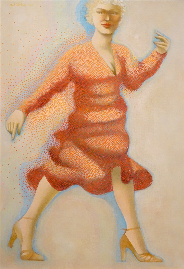 Mensen uit de wereld van het theater vinden in het werk van Aat Verhoog vaak iets terug dat lijkt op een scène uit een toneelstuk. Feit is dat zijn schilderijen bijna altijd over mensen gaan. De menselijke figuur, vrouwen, een enkele man (vaak een literator) en kinderen, zijn altijd het hoofdmotief in het werk van Aat Verhoog geweest. Niet dat er geen paarden, honden en katten in voorkwamen, maar de menselijke emoties of juist het gebrek daaraan, die ‘condition humaine' was de inhoud die de vorm bepaalde. Ook stillevens komen voor en ook het landschap, maar dan meestal als omgeving, niet zozeer als een onderwerp op zichzelf. De Engelsen hebben de uitdrukking ‘conversation piece' voor dit soort schilderijen van groepen mensen. Het zijn bij Aat Verhoog echter nooit echte groepsportretten al komt er zo nu en dan een bekend figuur, bijvoorbeeld een schrijver, op voor. Een verhaal uit de klassieke mythologie dient soms als uitgangspunt, zoals meer dan eens de gedaantewisseling van Daphne. Maar meestal worden wij betrokken bij een scène uit misschien een familiealbum, een theaterstuk, een dagboek of een verhaal. Dat is dan altijd weer een verhaal dat niet verteld maar wel geschilderd kan worden.
